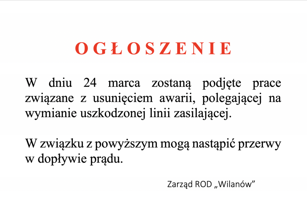 Uprzejmie informujemy, że w dniu 19 września (piątek) odbędą się prace związane z usunięciem awarii, polegającej na wymianie zużytej linii zasilającej.